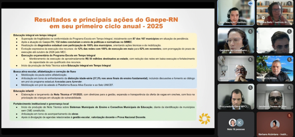 A apresentação das prioridades estratégicas do Gaepe-RN para 2026 foi conduzida por José Mauricio, do Instituto Articule. O coordenador de conhecimento apresentou um balanço que justifica as próximas metas, destacando a efetividade das ações: “Em 2025, o foco na Educação Integral em Tempo Integral gerou resultados expressivos: 132 redes de ensino concluíram o envio de suas políticas no SIMEC”. Ele celebrou, ainda, a evolução na execução financeira dos recursos do Programa Escola em Tempo Integral pelas redes potiguares de educação, saltando “de apenas 12% das redes com execução total dos recursos em maio para 62% em novembro”.